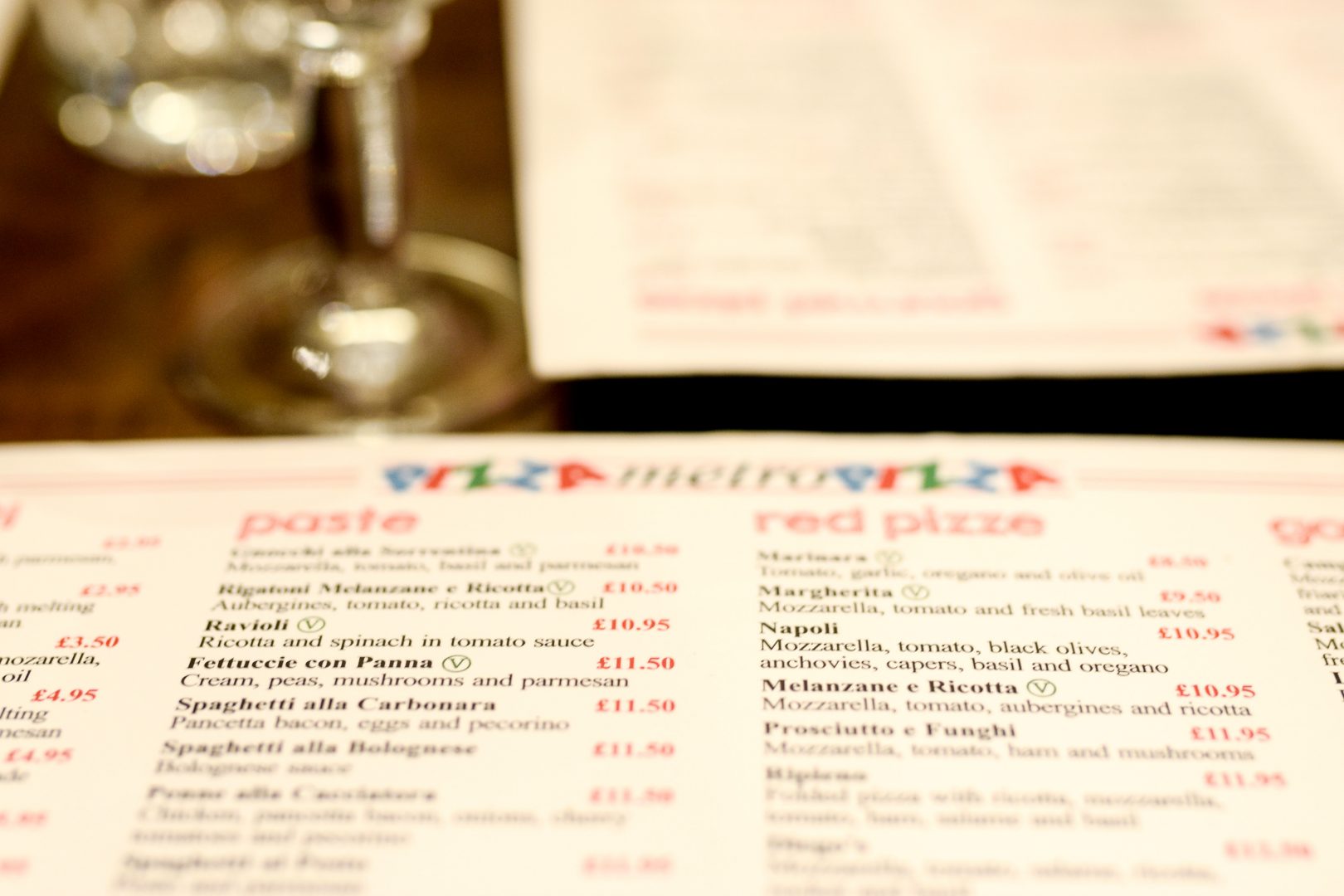In the entryway of the restaurant, they have their giant wood-burning oven. I learned that Pizza Metro was the first restaurant in London to cook meter-long pizzas in a wood-burning oven, so you know I had to order a meter-long pizza. The tables and chairs are simple but comfortable, perfect for a pizza parlor. The walls are filled with Italian memorabilia. I hope they get some booths soon because I’m definitely partial to booths over tables.