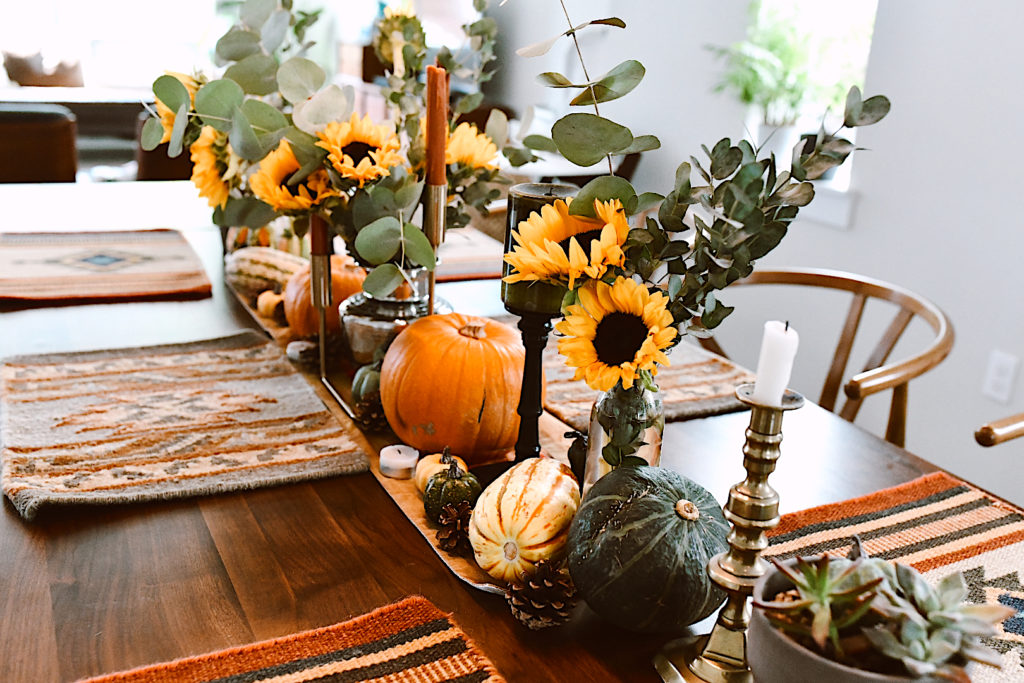 Since we spend so much time at home, I wanted our fall tablescape to be something that makes us smile whenever we walk by it. I wanted our fall table decor to be bright & cheery in the day & date-night dreamy at night. Besides those objectives, I also had another challenge. I wanted to use as many real pieces as possible. I don’t particularly like storing items year to year, and also, my husband cannot stand fake décor. I’m talking he truly hates it. Sometimes faux decor is best, in my opinion, but I wanted him to love our fall table décor as much as I did, so I aimed for as much real as possible. Here’s what I used to create our fall table décor: