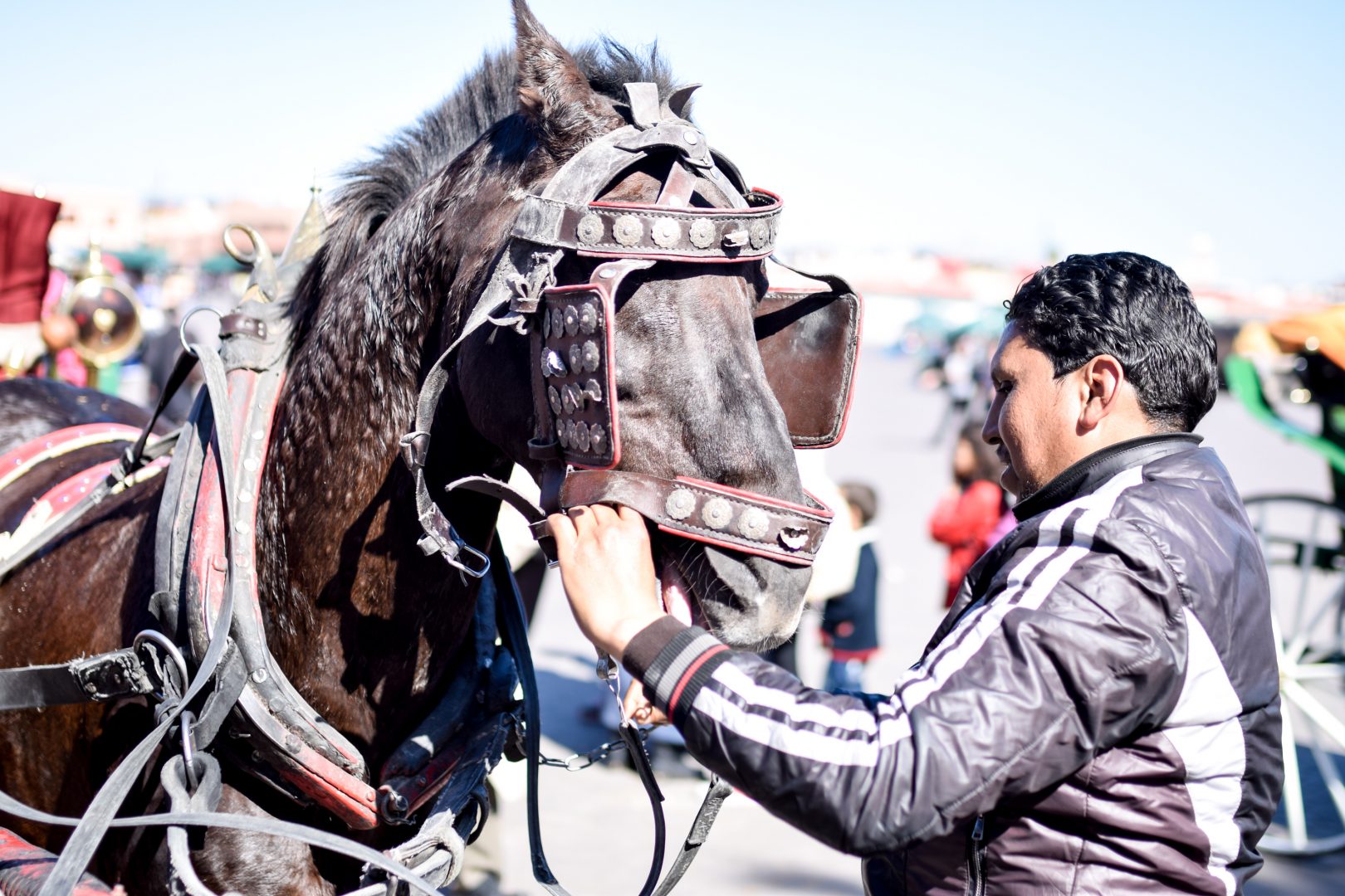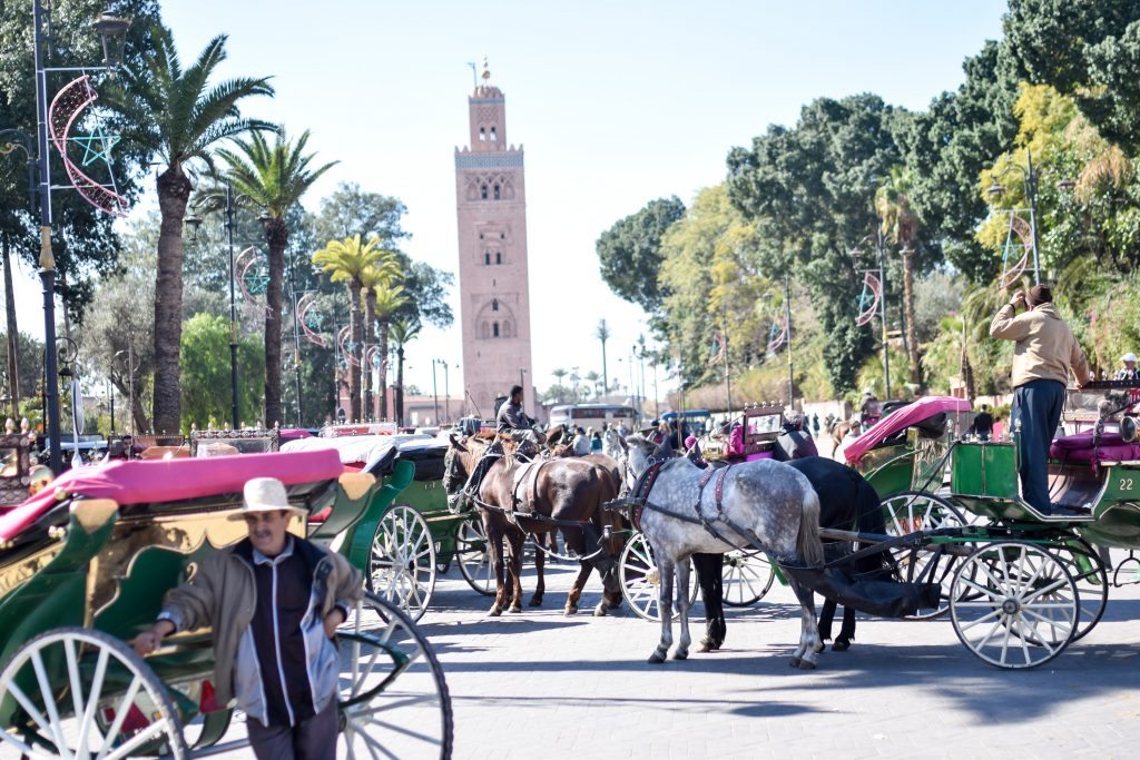 On our first day, we walked from our hotel to Jamaa el Fna, the square and marketplace in Marrakesh’s Medina quarter (old city). In Marrakesh, there is the new city and the old city. As it’s the main square of Marrakesh, Jamaa el Fna is filled with shops and, inevitably, tourists. While walking through the square, we noticed tens of horse-drawn carriages available for rent. We rented our own and took a tour of the new city. This was a really nice way to see other parts of Marrakesh without having to walk in the heat of the day. The horse ride was 45 minutes long and cost 100 Durham ($10usd). Worth it.
