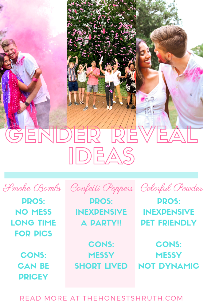 Below you can find my gender reveal ideas graphic! It’s filled with the pros and cons of each way that we revealed the gender to people in our lives. Feel free to pin, share, email, and save the pros and cons of smoke bombs, confetti poppers, and colorful powder!