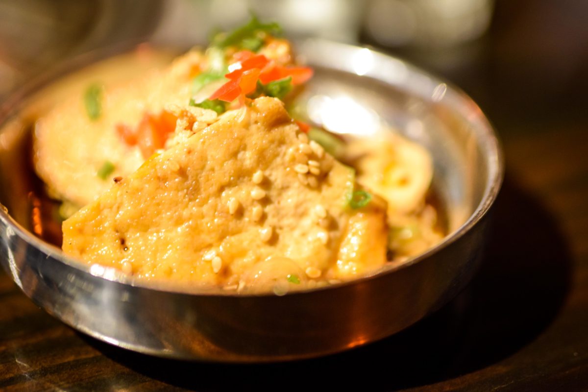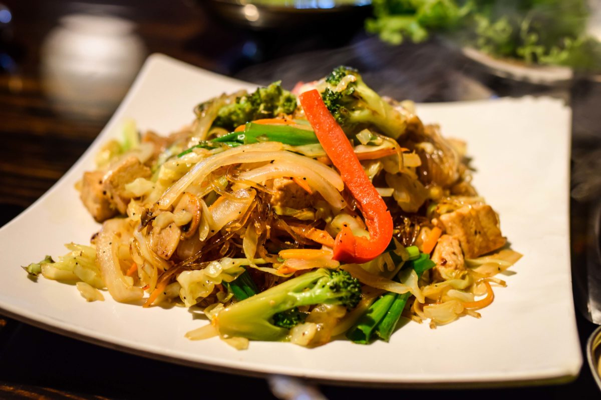Japchae: Japchae is a sweet and savory dish of stir-fried glass noodles (sweet potato noodles) vegetables and usually beef. Because I’m a vegetarian, they subbed tofu for the beef.