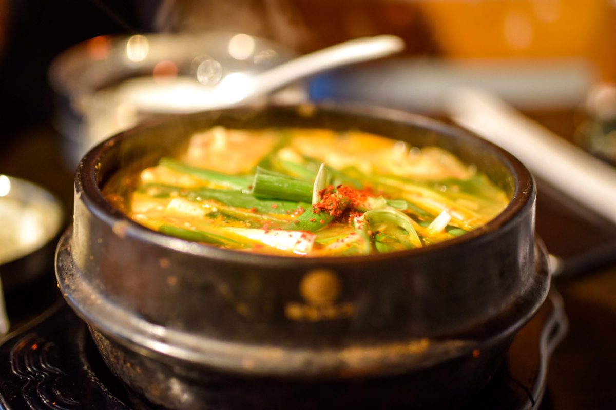 Doenjang Jigae: is a staple Korean stew made with doenjang (된장), fermented soybean paste, tofu, potatoes, onion, zucchini, mushrooms, red pepper, and sometimes meat.